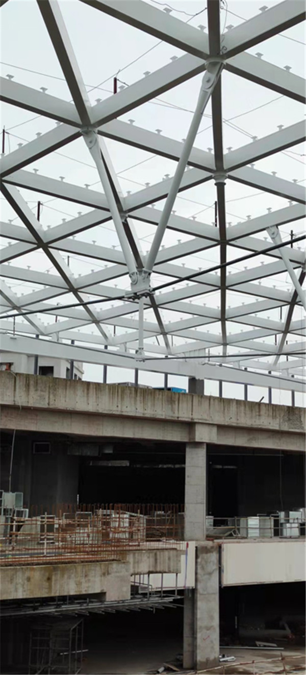 位于中央游乐区四角的商业体天窗接纳了张弦梁结构形式,与通例张弦结构对比,本工程张弦梁预应力撑杆接纳了不行摆动的三角牢固式撑杆,导致拉索无法按通例形式预偏安装。项目施工时接纳两端均可调治长度的拉索设计形式,并通过两端同步张拉的方式进行预应力施工;同时为制止两端张拉的差异步性导致索夹不平衡力过大而滑动,以及三角牢固撑杆水平受力过大而破坏,接纳细分级同步张拉控制技术保证了预应力的顺利建立。